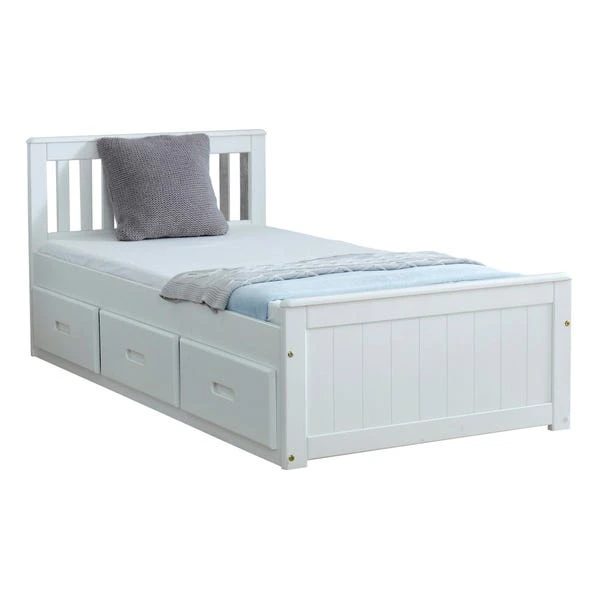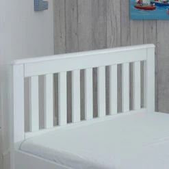 The Mission Storage Bed in White gives you a traditional single bed with a slatted headboard and a strong, durable construction which is crafted from pine wood. The bed also boasts 3 drawers for useful storage that will help you to organise your bedroom. During assembly, you also have the option to install the drawers on either side of the bed to suit your preference.