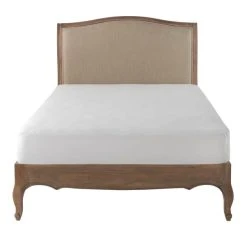 Designed with a natural upholstered large headboard with subtle scrolled and curved detail, this elegant bedstead is hand carved from solid pieces of 100% mango wood. Available in a choice of sizes, this bedstead features intricate grain with layers of light antique lacquer and decorative carved edges.