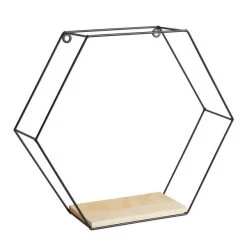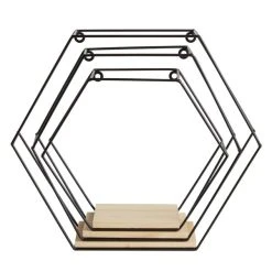 Constructed of a black, metal frame in the shape of a hexagon and finished with a natural wood shelf, these stylish shelves come in a set of 3. Perfect for showing off plants, trinkets, and other accessories, these shelves are made to be hung on the wall but can also be placed on a table or sideboard for a contemporary look.