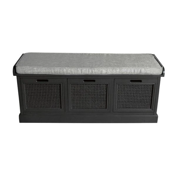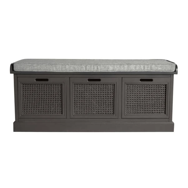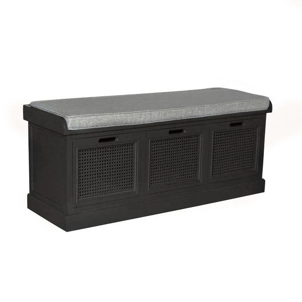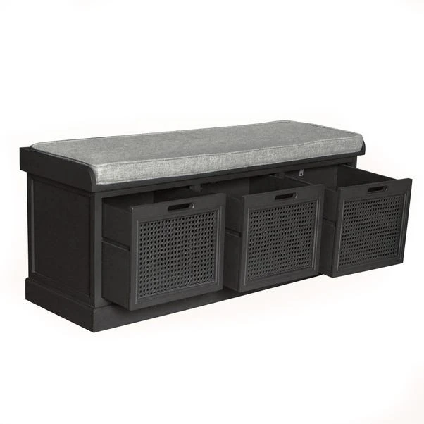 Featuring three spacious drawers with cut-out handles and woven cane design, this fully assembled storage bench offers a grey foam-filled seat cushion top and a Charcoal colourway with a lightly aged painted finish.