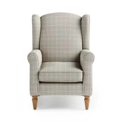Designed with comfort in mind, the Oswald armchair is upholstered in a smooth, window pane checked, woven fabric in a choice of natural and grey colourways and crafted with foam and fibre filled cushions. The pocket sprung seat and high back provide plenty of additional support, whilst the classic wingback design with scrolled arms, piped edge detailing and sturdy, oak finished wooden legs complete the look. The Oswald armchair is also available in a range of different colours, fabrics and sizes and offers easy assembly; just attach the feet and you’re ready to relax.
